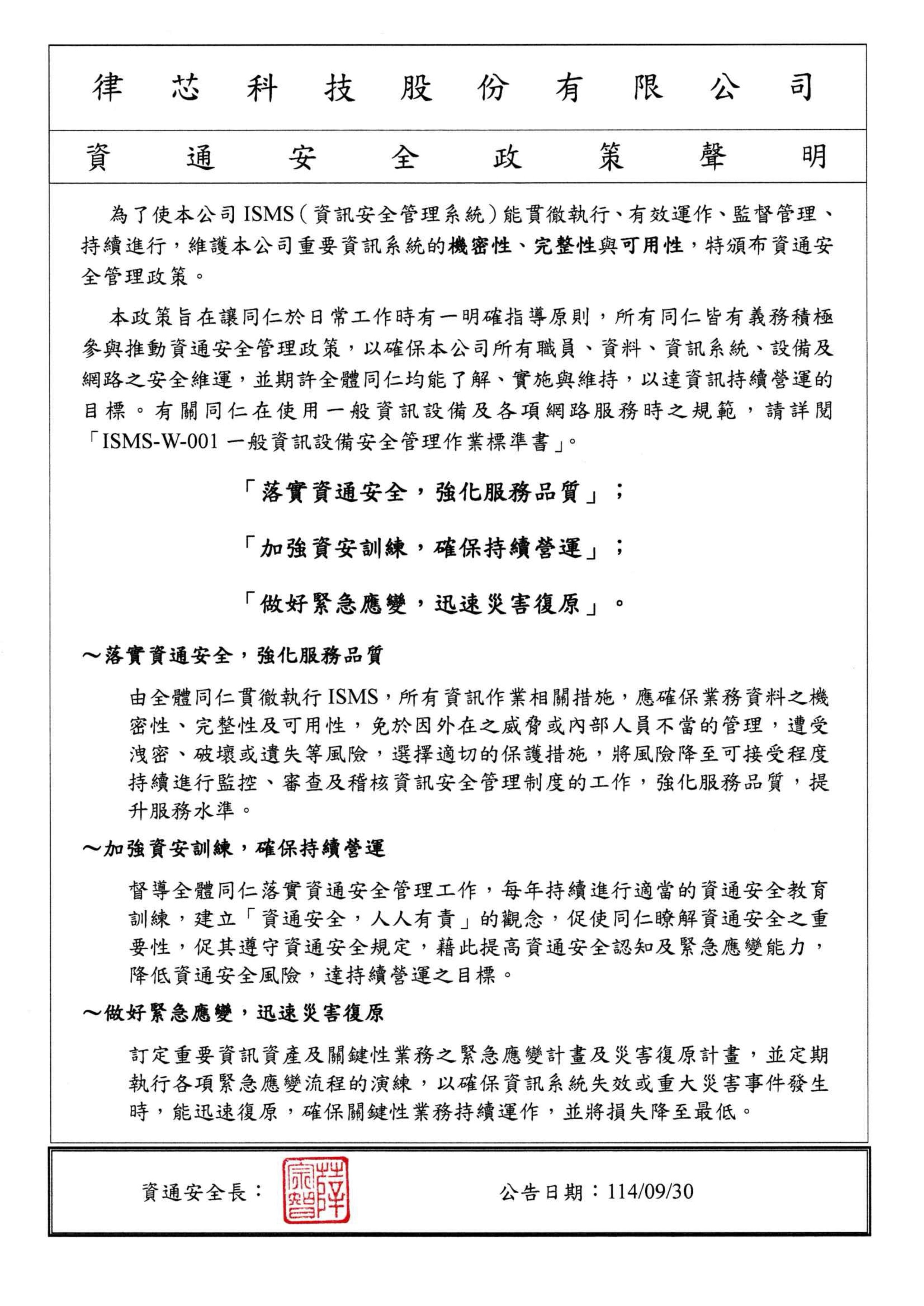 Our company is dedicated to maintaining a superior information security environment. To fully comply with government information security regulations and meet ISO 27001 certification standards, we hereby issue our “Information and Communication Security Policy Statement.”